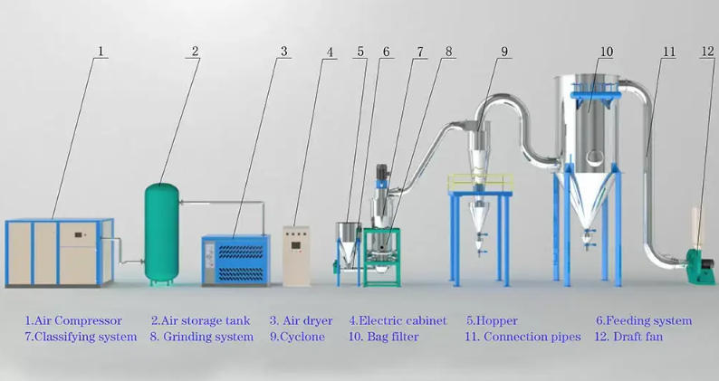 Le moulin à réaction LHL utilise de l'air comprimé qui est congelé, filtré et séché pour former un flux d'air supersonique injecté dans la chambre de concassage, fluidifiant le matériau.Les particules accélérées entrent en collision à l'intersection de plusieurs flux d'air de la buse., ce qui permet d'obtenir un concassage ultrafin grâce à des forces de collision, de friction et de cisaillement sévères.